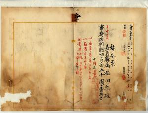 九七 嘉義庁長津田毅一ノ内申ニヨリ病気ノ為メ退官ヲ願出タル嘉義庁属植田忠雄ニ事務格別勉励ニ付キ一時金ヲ賞与ス