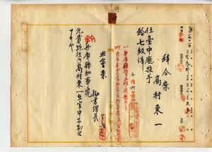四 台中庁長枝徳二ノ内申ニヨリ元兵庫県技手高村東一ヲ台中庁技手ニ任ス
