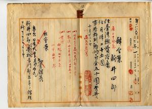四一 財務局長中川友次郎ノ内申ニヨリ東京出張所勤務雇新井四郎ハ病気危篤ニ陥リタルヲ以テ台湾総督府属ニ任シ昇級ノ上事務格別勉励ニ付キ一時金ヲ賞与ス