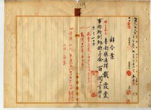一二 台南庁長松木茂俊ノ内申ニヨリ病気ノ為メ危篤ニ陥リ一一月一日ニ死亡シタル台南庁通訳戴霞棠ヲ本人平素職務勉励成績優良ナル故ヲ以テ特別ノ詮議ニヨリ一一月一日付ヲ以テ昇級サセ事務格別勉励ニ付キ一時金ヲ賞与ス