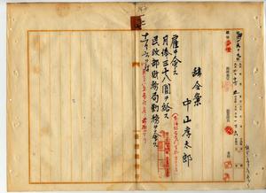 一七 財務局長中川友次郎ノ内申ニヨリ財務局主計課予算決算事務ノ為メ東洋協会専門学校卒業者元台湾総督府雇中山孝太郎ニ雇ヲ命シ民政部財務局勤務ヲ命ス