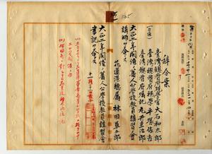 六一 学務部長隈本繁吉ノ内申ニヨリ台湾総督府視学官大石和太郎・台湾総督府視学平塚佐吉・台湾総督府嘱託丸井圭治郎ニ大正二年開催ノ蕃人公学校教員講習会講師ヲ命シ花蓮港庁属林田軍五郎ニ大正二年開催ノ蕃人公学校教員講習会書記ヲ命ス
