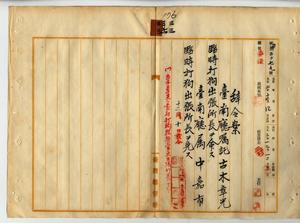 三三 台南庁長松木茂俊ノ稟申ニヨリ台南庁嘱託古木章光ニ臨時打狗出張所長ヲ命シ、台南庁属中嘉市ノ臨時打狗出張所長ヲ免ス