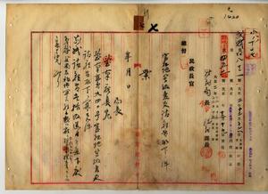 "七 四八三一 東京市麻布区一本松町ノ男爵安場末喜ヨリノ出願ノ台南庁嘉祥外里挓仔庄及ヒ長興上里大湾庄ノ官租地全部ニ対シ昵耕方出願ニ付認可(指令第九七一号)シタル処昵耕者台湾棉花栽培組合業務執行員男爵安場末喜ヨリ官租地等級変更ノ請願アリタル処更ニ同組合執行員安場末喜ヨリ出願書中訂正スベキ箇所アリタルニヨリ官租等級変更ニ関スル請願書下戻出願アリタルヲ以テ下戻シ且ツ官租地ニ関スル願書類ハ庁ニ出願スヘキモノニ付此ノ旨ノ申添ノ件"