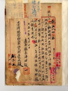 二 民土四九七・六六一・二九九・八九二・八九四・七三三・一六九一・七六六・二一二埤圳竣工報告並ニ埤圳新設等ニ関スル件一括二-1 民土第四九七号嘉義庁斗六堡石榴班庄ノ林福枝・張漏沁・張大頭ヨリ出願ノ私埤三共埤圳新設ノ件竣工シタルヲ以テ嘉義庁長津田毅一ヨリ報告ノ件二-2 民土第六六一号明治四五年五月二四日附指令第三八九号ヲ以テ認可セラレタル台中庁藍興堡台中街林子瑾ヨリ私設埤圳ノ南投庁北港溪堡烏樹林埤圳竣工届アリタルニ付南投庁長石橋亨ヨリ回答ノ件二-3 民土第二九九号台中庁藍興堡台中街林子瑾ヨリ出願ノ南投庁北港溪堡茄溝庄ノ東岸ニ接スル土名塩菜坑ノ中間鳥溪ヨリ三二〇間ノ点ニ堰堤新設並ニ水路開鑿ニ付私設埤圳新設ヲ認可ス(指令第二一八九号)二-4 民土第八九二号大正六年六月二〇日附新庶第一二四二号ヲ以テ稟申ニ及ヒタル新竹庁管下竹南一堡中港街許生ヨリ出願ノ三四圳新設ノ件官有地使用ニ関スル問題アリタルニヨリ出願人ヨリ取下方申出タルニヨリ一件書類返戻方新竹庁長家永泰吉郎ヨリ依願ノ件二-5 民土八九四号大正二年六月二〇日付新庶第一二四三号ヲ以テ稟申ノ新竹庁管下新竹街土名南門何文漢ヨリ出題ノ埤圳新設ニ付再調査シタル処設計変更ノ必要ヲ生シタルニヨリ一件書類全部返戻方新竹庁家永泰吉郎ヨリ照会アリタルニヨリ返戻ス二-6 民土第七三三号宜蘭庁民壮囲堡壮三庄ノ黄長庚ヨリ出願ノ四囲堡匏杓崙庄土名小礁溪ニ圳路開鑿スルノ件埤圳新設ヲ認可(指令第八六一八号)シ宜蘭庁長小松吉久ヨリ同埤圳竣工ニ付報告ノ件二-7 民土第一六九一号桃園庁管内海山堡大嵙崁街簡阿牛ヨリ出願ノ海山堡内柵庄土名埔尾ノ埤圳(明治四五年六月一〇日指令第二三七七号)竣工シタルニ付桃園庁長武藤針五郎ヨリ報告ノ件二-8 民土第七六六号桃園庁海山堡大嵙崁街土名上街簡阿牛ト三層区長顔有木ヨリ出願ノ壺爐坑圳新設ノ件認可(指令第二三七七号)二-9 民土第二一二号嘉義庁嘉義西堡嘉義街土名南門御厨徳五郎ハ領台以来本島ノ旱魃ハ実ニ農業進歩ノ第一障害ナルモ特ニ嘉義地方ハ旱魃ノ被害他ニ比シテ多大ナルヲ以テ埤圳ノ設備ヲナスベキトスル御厨ヨリ出願ニ係ル嘉義庁西堡後湖庄・北社尾庄・埤仔頭庄ニ認定外埤圳御徳埤圳新設ノ件認可(指令第六九四九号)シ竣工シタルヲ以テ嘉義庁長津田毅一ヨリ報告ノ件