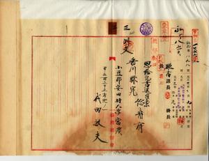 三 慢性麻拉里亜ニ罹リ退官シタル元台湾総督府通信属代田敏夫ニ恩給証書送付ノ件(官秘第一七六六号)