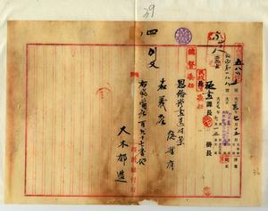四 麻剌利亜ニ罹リ退官シタル元台湾総督府通信属大木郁造ニ恩給証書送付ノ件(官秘第五八〇号)