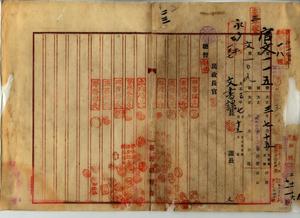 二三 明治三七年五年保存文書中第一門ノ皇室儀典第二類祝祭及慶弔、第二門ノ官規官職第一類官制・第二類行政区域・第三類処務規程・第四類進退・第五類位記及勲章・第六類検定及試験・第七類服制徽章・第八類服務・第九類懲戒・第一〇類委任・第一一類会議・第一二類出張・第一四類願伺届・第一五類官衙・第一六類定員・第一七類代理・第一八類賜暇・第一九類雑中ノ各文書ヲ廃棄スルノ件(官文第一一五号)
