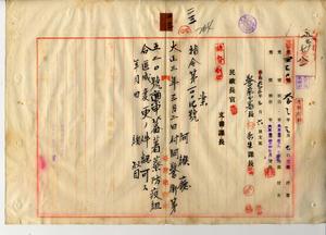二三 阿緱庁長佐藤謙太郎ノ稟申ニ係ル蕃薯藔防疫組合区域変更ノ件認可ス(指令第一〇〇四号・民警第四三〇号)