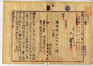 六 加藤高明外務大臣ヨリ瑞西政府及支那政府ガ局外中立ヲ宣言シタル旨通知ニ付キ各庁長・陸海軍参謀長・各官衛長ヘ通知ノ件(官外第二八二号)