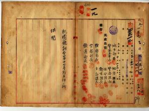 一九 桃園庁ノ訓令供閲ノ件(民地第三六一二号)一九-一 桃園庁訓令第一七号 支庁警察官吏派出所薪炭油費小使給及警察官吏駐在所薪炭油費ハ月額払切トスルノ件並ニ大正二年八月訓令第一二号ハ廃止ス一九-二 桃園庁訓令第一八号 明治三九年四月第一六号墓地火葬場及埋火葬取締規則取扱手続改正ノ件一九-三 桃園庁訓令第一九号 大正二年七月訓令第八号判任官各官定員中改正ノ件一九-四 桃園庁訓令第二〇号 大正二年七月訓令第九号各課各支庁判任官配置定員中改正ノ件一九-五 桃園庁訓令第二二号 明治四〇年五月訓令第二二号公学校財務規程取扱手続施行細則中追加ノ件並ニ明治三八年四月訓令第一二号ヲ廃止ス一九-六 桃園庁訓令第二一号 台湾私設軌道営業者及台車後押人夫取扱規則取扱手続制定ノ件