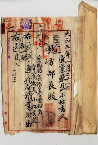 一一 宜蘭庁公共衛生費整理者宜蘭庁長小松吉久ヘ宜蘭庁浮洲堡叭哩沙庄月眉河川五箇所及月眉官有地ヲ公共用水道鉄管埋設用地トシテ官有地無料使用許可ノ件(指令第一三六〇一号・同第一三六〇二号・民地第三六四六号)