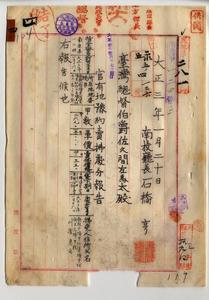 四 南投庁埔里社堡埔里社街ノ官有地ヲ埔里社街川澄恵之ヘ官有地予約売払処分報告ノ件(明治四四年民内第四九五五号・民地第二八一号・指令第四九八一号)