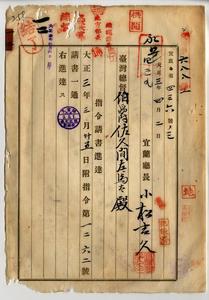 一二 宜蘭庁公共衛生費整理者宜蘭庁長小松吉久ヘ官有地無料使用許可ノ件(民地第六八八号・指令第一二六二号)