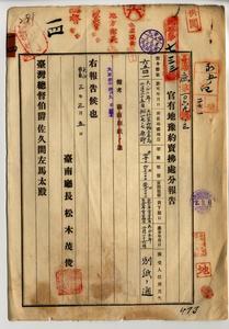 一四 台南庁大竹里打狗ノ謝扶生・王戇・葉貢・孫華・孫樟・李漏馬・林讃成・許弁・麦石允・稲垣友吉・呉乞食・林番薯・許仁力・欧嚷・呉綜ヘ台南庁烏松原野ノ官有地売払処分報告ノ件(民地第七三三号・指令第六五四一号)