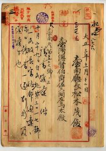 三 私立台南幼稚園設立者ノ川原義太郎ト関善次郎ノ出願ニナル台南幼稚園舎新築ノ為メ台南庁台南市乙ノ建物敷地ノ官有地無料使用許可ノ件(指令第二八四七二号・民地第三〇一七号)