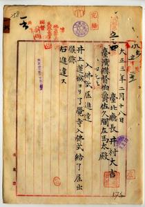 一六 本派本願寺台北別院輪番紫雲玄範代理了覚寺寺務取扱主任井上蓮城ト信徒惣代蓑和藤治郎・田村積太郎・江上房太郎ヨリ届出ノ了覚寺入仏式結了シタルニ付キ台北庁長井村大吉ヨリ進達ノ件(民地第五三四号)
