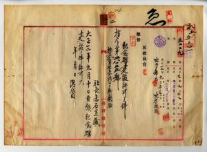 二 株式会社台湾日々新報社社長赤石定蔵ヨリ出願ノ円山公園ニ同社物故社員供養ノ為メ表面ノ碑銘ヲ筆塚・男爵後藤新平書、裏面ヲ大正三年秋分之日・為台湾日々新報社員供養建之・大東学人木下新三郎書トスル高五尺ノ青石ノ碑石ニ高一尺五寸・幅六尺ノ御影石ノ台座石ニヨル紀念碑建設ヲ許可スルノ件(指令第二八〇五五号・民地第三二二九号)
