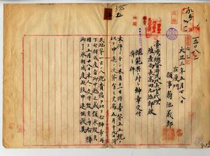 五 現在支那厦門戸部英爪樹脚ニ転住シタル施範其(旧彰化庁馬芝堡鹿港街)ヨリ紳章紛失ニ付キ再下付方在厦門領事菊地義郎ノ申進ヲ以テ願出タルニヨリ紳章再下付ノ件(民地第一六〇八号)