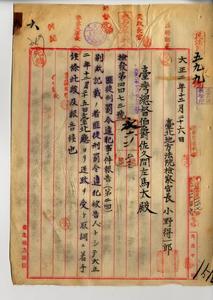 六 台北地方法院検察官長小野得一郎ヨリ匪徒刑罰令違反被告人トシテ大正二年一二月二五日台北庁ヨリ送致サレタ張氏佑・葉加車・林麒麟・林春長・蔡■(毛+彡)毛・鍾金・陳魁・荘風雨・翁才・李三許ノ取調ニ着手シタル旨報告ノ件(民法第五九九号)