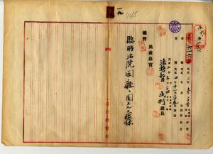 一九 匪徒刑罰令ニ掲ケタル犯罪事件ヲ審判セシムル為メ新竹庁苗栗ニ臨時法院ヲ設置シタルヲ以テ目下桃園、新竹、台中、台南及阿緱各庁下デ起リタル革命党員募集ニ関スル陰謀事件ヲ審判スルニヨリ右事件ニ付キ既ニ法院ニ繋属中ノモノモ全テ同法院ノ管轄ニ移スヘキ旨通牒ノ件(民法第六一六号)