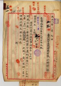 三一 台北地方法院検察官長小野得一郎ヨリ匪徒刑罰令違犯被告人トシテ大正三年一月六日カラ八日迄ニ新庄・士林・枋橋・基隆各支庁ヨリ送致サレタル李阿獅・張古井・陳垂堃・簡進善・蔡金井・葉潭・呉朝郎・陳明温・陳神化・郭双溪・陳獅・劉俊傑・謝水乞・許茂・曽春貴・陳阿土ノ取調ニ着手シタル旨報告ノ件(民法第二三号)