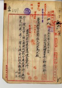 三二 台北地方法院検察官長小野得一郎ヨリ目下捜査中ニ係ル匪徒刑罰令違反事件ノ捜査程度表ヲ報告ノ件(民法第二八号)