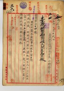 三六 台北地方法院検察官長小野得一郎ヨリ匪徒刑罰令違反被告人トシテ大正三年一月一五日苗栗支庁ヨリ送致サレタル謝定香・林阿斗・浜安薯・陳本・黄琳堂・謝阿業・謝水生・謝阿水・陳港・葉阿志・謝桂香・謝建昌・何阿龍・徐阿発・張阿隆・羅阿宏・羅阿煥・江阿月・江湊丁ノ取調ニ着手シタル旨報告ノ件(民法第三四号)