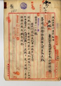 三八 台北地方法院検察官長小野得一郎ヨリ匪徒刑罰令違犯被告人トシテ大正三年一月一六苗栗支庁及ヒ三叉河支庁ヨリ送致サレタル彭阿水・謝阿昌・蔡金生・陳超賡・劉木生・謝石木・黄阿坤・徐炳旺・湯其宗・陳北清・黄盛康(支那人)・彭阿坤・羅慶庚・羅東萃・黄増富・劉承輝・頼延彰・李仁昌・陳阿賢・李鴻昌・李盛育・超阿喜・李春郎・陳栄萃・頼九捷ノ取調ニ着手シタル旨報告ノ件(民法第三七号)