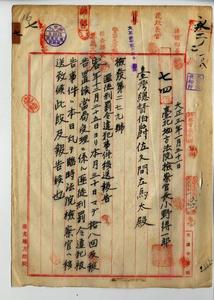 七 台北地方法院検察官長小野得一郎ヨリ客年一二月二五日ヨリ本月三〇日迄一八回報告シタル台北地方法院検察局受理ニ係ル匪徒刑罰令違犯事件ハ一月三一日ヲ以テ凡テ臨時法院検察官ヘ移送ノ件(民法第七四号)