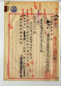 一三 台北地方法院検察官長小野得一郎ヨリ匪徒刑罰令違反事件トシテ大正三年二月一日咸茉硼支庁ヨリ送致サレタル陳鴻来ハ取調ノ上即日臨時法院検察官ニ送致ニ付キ報告ノ件(民法第八四号)