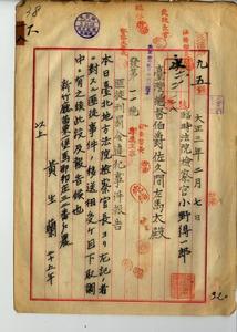 一八 臨時法院検査官小野得一郎ヨリ本日台北地方法院検察官長ヨリ黄生蘭ニ対スル匪徒事件ノ移送相受ケタ目下取調中ナル旨佐久間左馬太総督ヘ報告ノ件(民法第九五号)