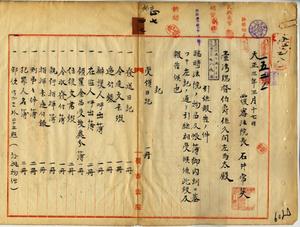 四七 臨時法院ノ物品及帳簿ハ其ノ目録ヲ添ヘテ覆審法院ニ引継クヘキ旨臨時法院上席判官及ヒ上席検察官ヘ三月三日付内訓(内訓第二号)並ニ右件ニ付キ覆審法院長ヘ引継ヲ受クベキ旨ヲ同日付ニテ内訓(内訓第三号)ノ件及ヒ覆審法院丁石井常栄ヨリ内訓ニ従ヒ受領日記一冊・発送日記一冊・令達文書綴一冊・逓付録一冊・弁護人呼出簿一冊・在監人呼出簿二冊・領置金品受渡処分簿一冊・往復文書綴二冊・令収発付簿一冊・執行指揮簿一冊・指揮書逓付録一冊・刑事事件簿二冊・犯罪人名簿二冊・郵便はかき外二五点(証拠物件)・参考書一袋・証拠書類翻訳書一綴ノ引継ヲ受ケタル旨報告ノ件(民法第一五二号)