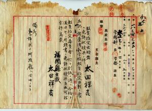一 福岡県立東筑中学校助教諭心得太田祥吉ヨリ小学校教員無試験検定願ニ付キ教員免許状授与ノ件(民学第一八三四号)