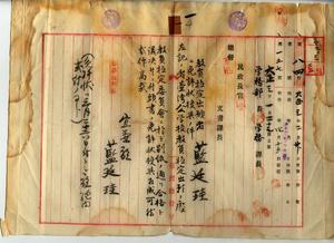 一 公学校訓導免許ヲ有スル藍廷珪ヨリ教員無試験検定願ニ付キ教員免許状授与ノ件(民学第八四号)