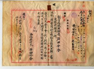 一七 島根県小学校本科正教員免許ヲ有スル石田安春ヨリ教員無試験検定願ニ付キ教員免許状授与ノ件(民学第七ノ三号・同一〇八七号)