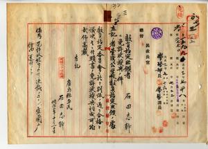 三 広島県小学校本科正教員・台湾総督府尋常小学校本科正教員免許ヲ有スル石田志幹ヨリ教員無試験検定願ニ付キ教員免許状授与ノ件(民学第七ノ三号・同一五九九号)