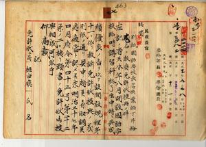 七 臨時講習科修了者中ノ葉炳丁・李讃生・陳張土・朱阿貴・蘇阿嬰・陳串根・頼石伝・陳振能・葉清泉・呉義陣・潘清潤・陳蔡喜ニ教員免許状授与ノ件(民学第七ノ三号・同二二二四号)