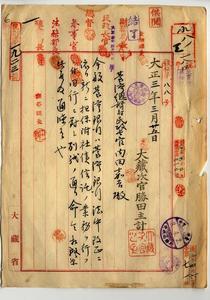 一 大蔵次官勝田主計ヨリ台湾総督府民政長官内田嘉吉ヘ台湾銀行法中改正ニ依リ新ニ担保附社債信託ノ業務ヲ行フニ付キ同行ニ対スル命令通牒ノ件(民財第一九二三号)
