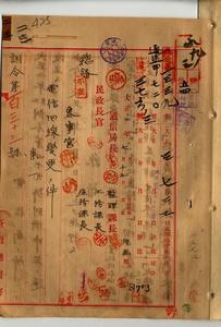 二三 大正二年三月訓令第四九号別冊電信回線表・電報中継順路表・同時通信回線表中改正(訓令第一三三号)、大正三年七月三一日限大稲埕郵便出張所ニ於テハ電報配達事務ヲ取扱ハス(告示第一二一号、民通第一三三九号)