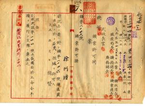 二八 台北庁管内ノ石炭採掘願ニ付キ徐阿増ニ鉱第一二四六号ノ鉱業許可ノ件(民殖第一四四号)