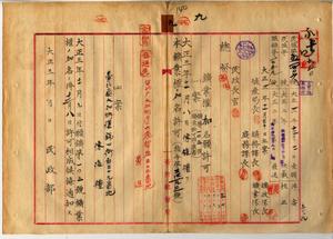 九 鉱業人黄濕・黄水生・李江海ノ台北庁管内ノ石炭鉱区鉱業権ニ陳復礼ノ加名願許可ノ件(指令第三四一九三号・民殖第五四〇六号)