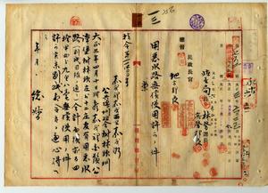 一三 嘉義公共埤圳組合樹林頭圳管理者嘉義庁長津田毅一ヘ官有用悪水路無償使用願許可ノ件(民殖第一七六二号・指令第一一四〇〇号)