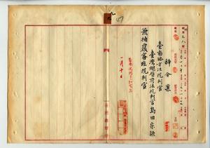 九 覆審法院長石井常英ノ内申ニヨリ台湾総督府法院判官台南地方法院判官島田宗謙ヲ覆審法院判官ニ兼補ス(秘甲第三八号)