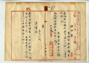 一四 事務官石井為吉ニ民政部法務部長手島兵次郎不在中ノ代理ヲ命シ、参事官片山秀太郎ノ民政部法務部長代理ヲ免ス(秘甲第一四三号)