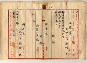 三 覆審法院長石井常英ノ内申ニヨリ福山区裁判所判事篠崎正ヲ台湾総督府法院判官ニ任シ高等官六等ニ叙シ八級俸ヲ下賜シ台北地方法院判官ニ補ス(秘甲第一一九二号)