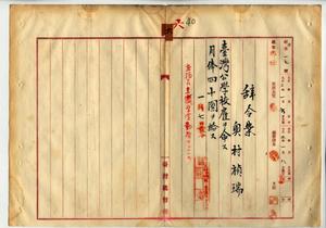 六 元岐阜県可児群御嵩町御嵩尋常小学校代用教員ニシテ台北庁大加蚋堡山仔脚庄円山臨済寺ニテ禅学ヲ研究セシ奥村禎瑞ヲ支那福州在住籍民子弟教育ヲ為シタル東瀛学堂勤務ノ為メ台湾公学校雇ヲ命ス(秘甲第一七号)[一〇も見よ]