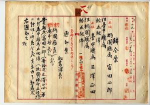 一八 桃園庁長武藤針五郎ト台中庁長枝徳二ノ内申ニヨリ桃園庁属富田二郎ヲ台中庁属ニ任シ五級俸ヲ給シ、台中庁属三沢正四ヲ桃園庁属ニ任シ五級俸ヲ給ス(秘甲第四九号)