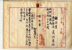 二五 阿緱庁長佐藤謙太郎ト南投庁長石橋亨ノ内申ニヨリ南投庁属荒川彦七ヲ阿緱庁属ニ任ス(秘甲第六二号)