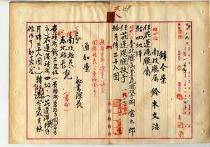 三八 花蓮港庁長飯田章ノ内申ニヨリ台南庁属鈴木文治ヲ花蓮港庁属ニ任シ四級俸ヲ給シ、台北庁属兼台北庁技手岡常太郎ヲ花蓮港庁技手ニ任ス(秘甲第八九号)